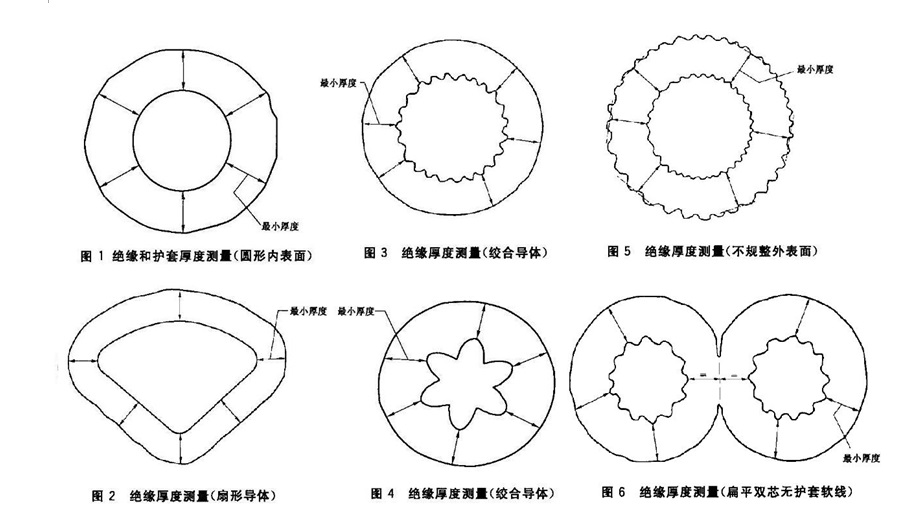 E), 沒有護套的扁平軟線,按照圖6測量,兩個導體之間最短距離的一半作為絕緣線芯的絕緣厚度。在以上所有情況下,第一次都應該在絕緣最薄處進行采點測量。